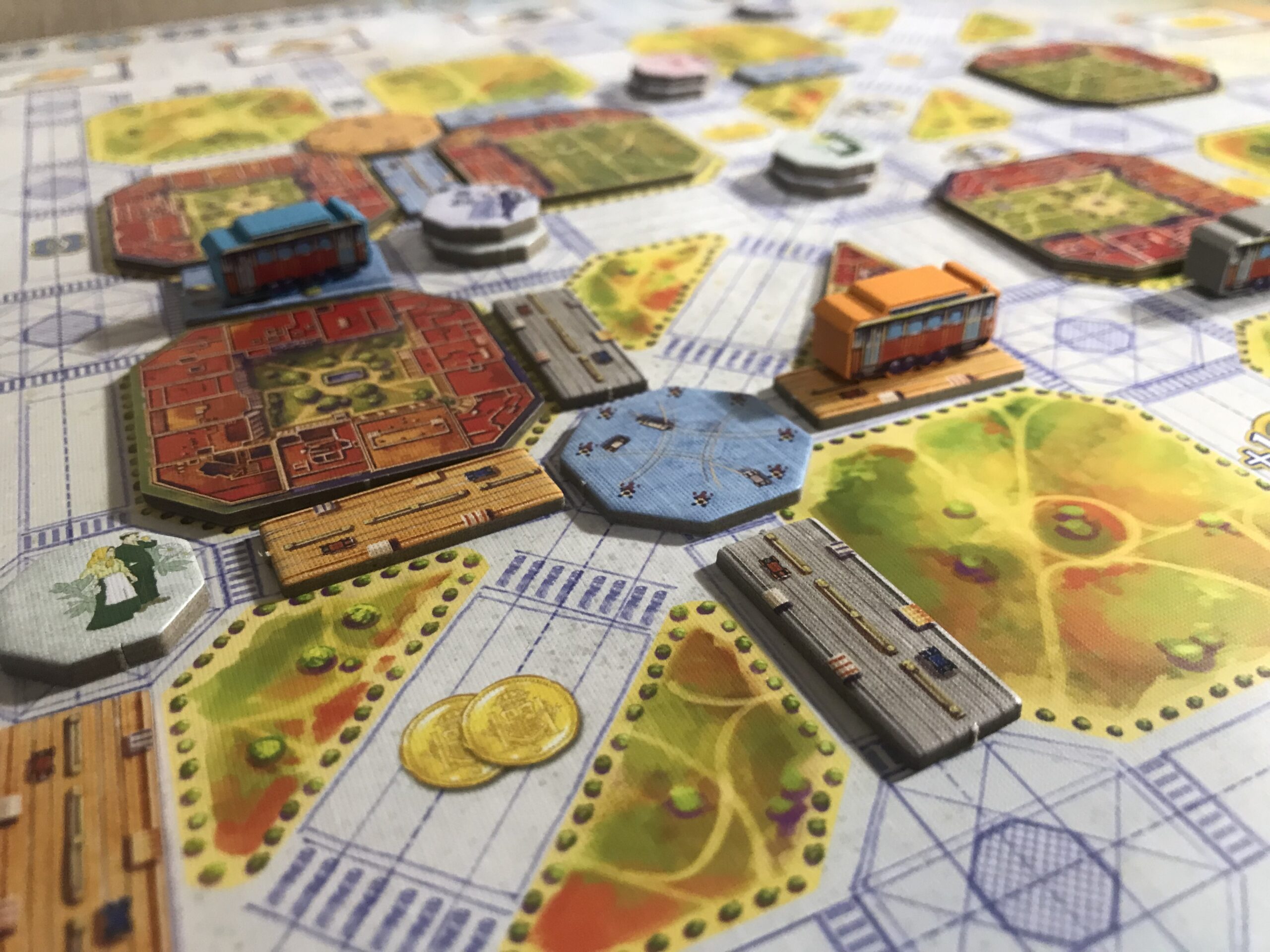 - swoje dwa znaczniki obywateli wykłada się na dostępne pola na planszę główną. Każde pole to minimum dwie akcje jakie będzie można wykonać w swojej turze (w zależności od kolumny i wiersza gdzie jest nasz znacznik). Może to być pozyskanie zasobów, znaczników punktowania, przejazdu tramwajem, czy budowa dróg i przesuwanie się po różnych torach;
