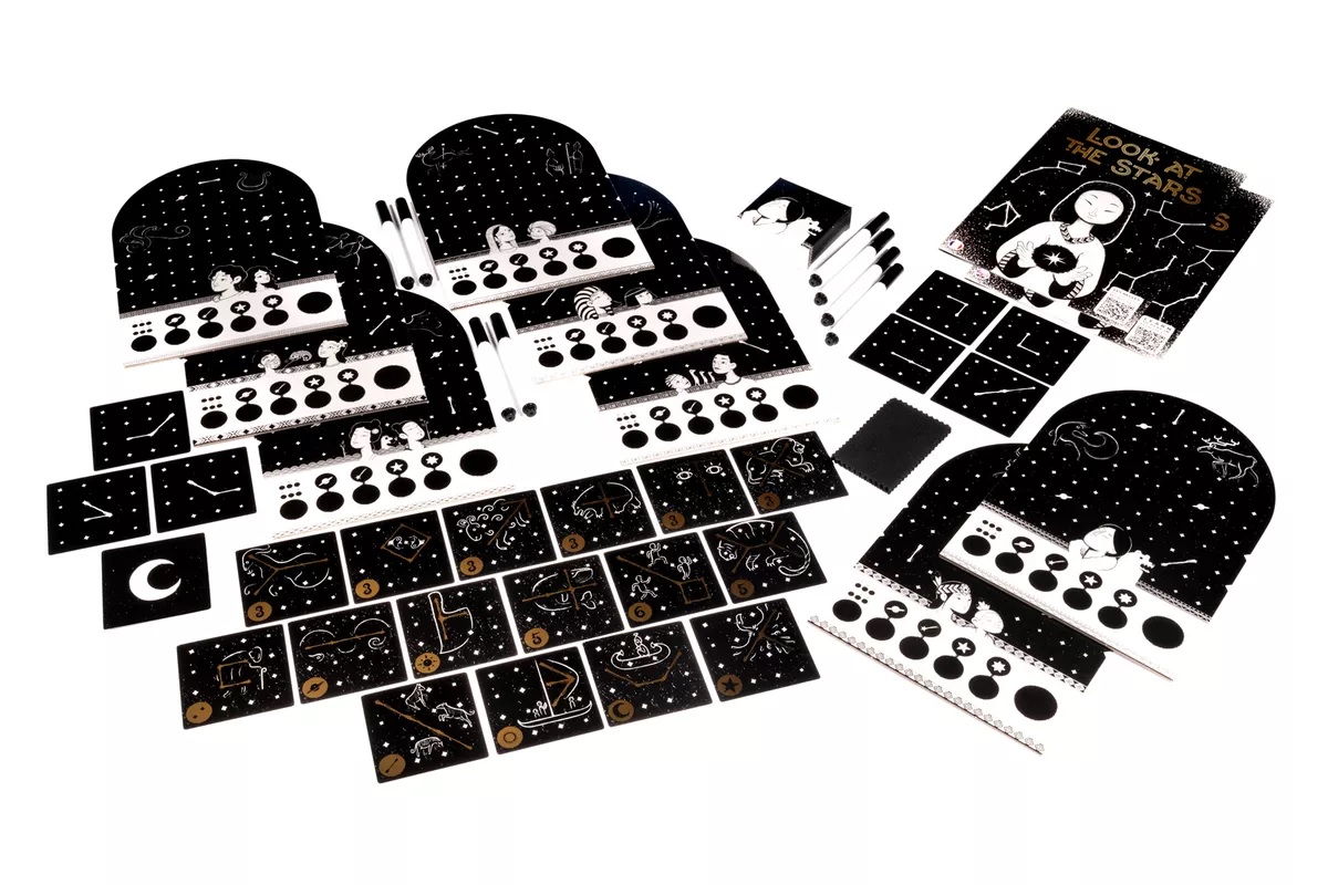 Look at the Stars - komponenty gryW Look at the Stars, każdy z graczy dostanie własną, asymetryczną planszę nocnego nieba. Waszym zadaniem będzie, odrysowanie na niej wzoru konstelacji lub spadających gwiazd, z odkrytej w turze karty nocy. Karty te ułożone są w trzech równych stosach na środku stołu. Rysowane linie możecie dowolnie obracać, łączyć z liniami już narysowanymi oraz mogą się one nawzajem przecinać.