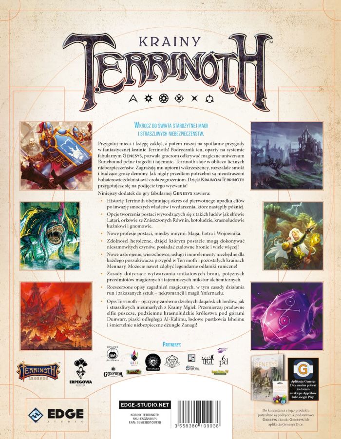Przygotuj miecz i księgę zaklęć, a potem ruszaj na spotkanie przygody w fantastycznej krainie! Genesys RPG: Krainy Terrinoth to podręcznik pozwalający graczom odkrywać magiczne uniwersum Runebound pełne tragedii i tajemnic. Terrinoth staje w obliczu licznych niebezpieczeństw. Zagrażają mu upiorni wskrzeszeńcy, rozszalałe smoki i budzące grozę demony. Jak nigdy przedtem potrzebni są nieustraszeni bohaterowie zdolni stawić czoła zagrożeniom. Dzięki Krainom Terrinoth przygotujesz się na podjęcie tego wyzwania!