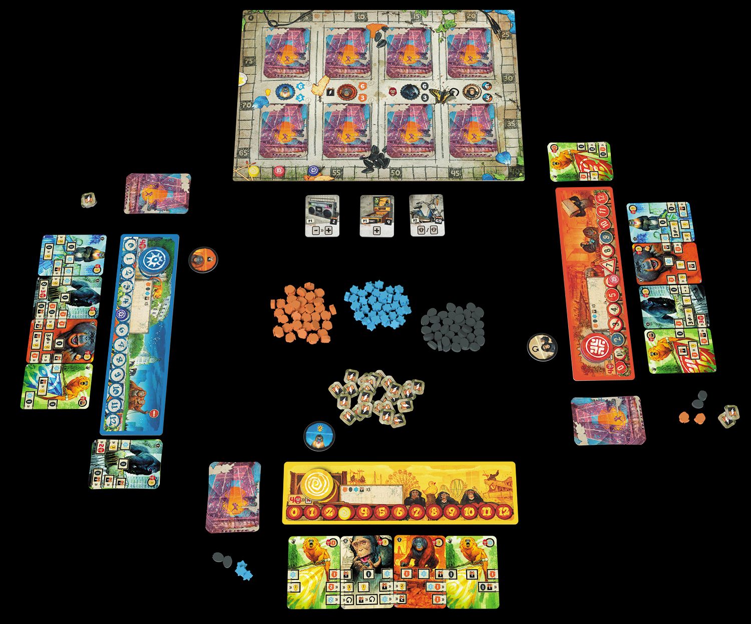 Zamiast nas - elementy gryPodczas gry wcielisz się w lidera plemienia, które na początku rozgrywki składa się jedynie z kilku tamaryn. Motywując je do wspólnej pracy, będziesz zdobywać zasoby, które pomogą ci zwabić inne gatunki małp. Goryle, orangutany, szympansy i mandryle dołączą do ciebie w toku gry, zwiększając możliwości twojego plemienia. Aby wygrać, musisz osiągnąć przynajmniej 80 punktów zwycięstwa szybciej, niż twoi przeciwnicy. W każdej rundzie będziesz dobierać 4 karty i łączyć je w Zgromadzenie Naczelnych. W ten sposób stworzysz rzędy ramek, które pozwolą ci na zbieranie zasobów i punktów zwycięstwa a także aktywowanie specjalnych umiejętności. Na końcu każdej rundy będziesz mieć możliwość dołączenia do swojego plemienia nowego członka, zwiększając jego potencjał.