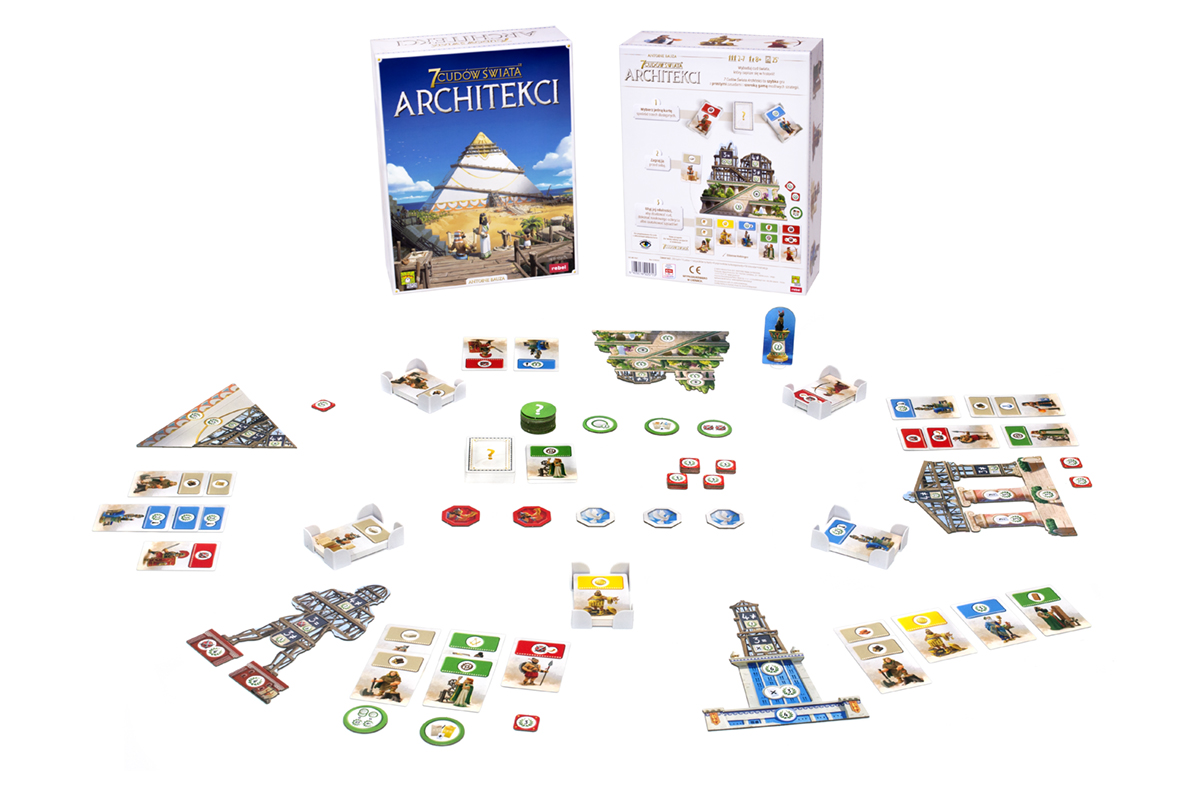 Architekci 7 cudów świata to dynamiczna gra rodzinna, doskonała na początek przygody z planszówkami! Podczas rozgrywki staramy się wznieść własną budowlę, jak najlepiej wykorzystując efekty dostępnych kart. W swojej turze wybierasz 1 z 3 kart, na których znajdziesz różne postacie pomocne w zdobywaniu surowców do budowy cudów, dokonywaniu odkryć naukowych oraz toczeniu bitew z sąsiadami. Kluczem do zwycięstwa jest umiejętne korzystanie z nadarzających się okazji i wybieranie najlepszych możliwych opcji. Każda dostępna karta przyniesie nam określony bonus: surowce niezbędne do budowy cudu, monety, którymi możemy zastępować te surowce, punkty zwycięstwa przydatne na koniec gry, tarcze zwiększające naszą siłę militarną oraz dodatkowe bonusy w postaci żetonów postępu. To od nas zależy, jaki kierunek rozwoju wybierzemy. Gra kończy się, gdy któryś z uczestników skończy budować swój cud. Zwycięża osoba z największą liczbą punktów.