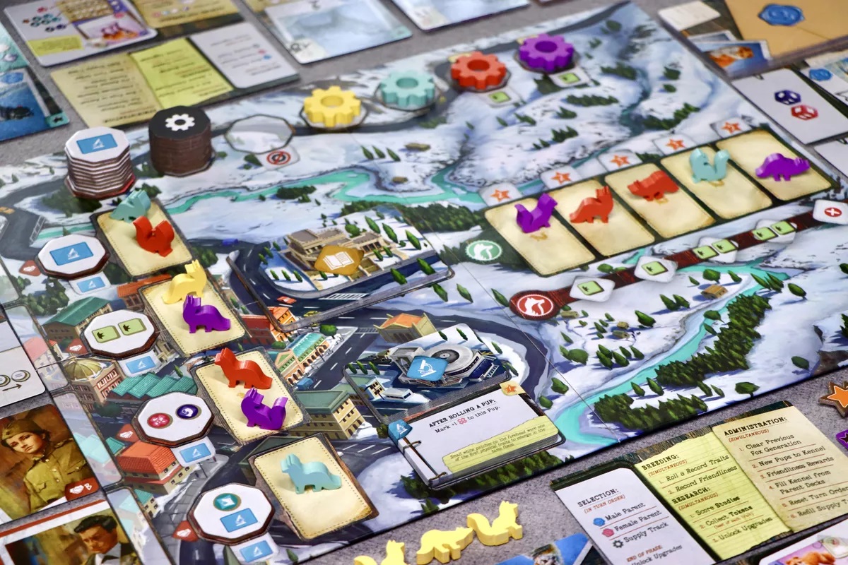 The Fox Experiment. Komponenty gryW grze zajmiemy się hodowlą udomowionych lisów. Odpowiednia selekcja lisów pomoże ukończyć badania z sukcesem, dzięki czemu sponsorzy będą zadowoleni – czyli w praktyce zdobędziemy za nie punkty, które pozwolą wygrać grę.