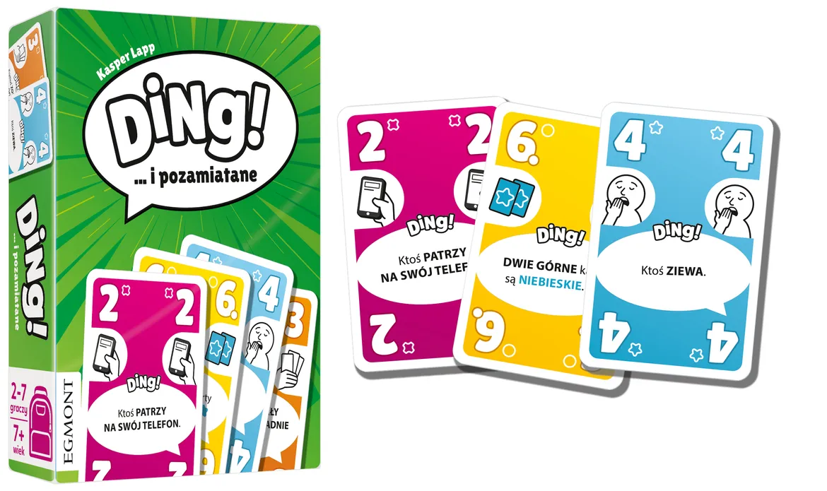 Ding i pozamiatane - elementy gry i pudełkoZakłóć kolejność, wprowadź zamieszanie, pozbądź się kart jako pierwszy. Celem gry jest jak najszybsze pozbycie się kart z ręki. W kolejności zgodnej z ruchem wskazówek zegara gracze odrzucają swoje karty, dopasowując je kolorem lub wartością do karty poprzednika. Jednak można zaburzyć porządek gry, bowiem na każdej karcie znajduje się dodatkowa reguła, która pozwoli pozbyć się kart poza kolejnością! Musimy przy tym nieustannie obserwować zachowania innych, aby z tych reguł skorzystać. To wcale nie jest takie proste.