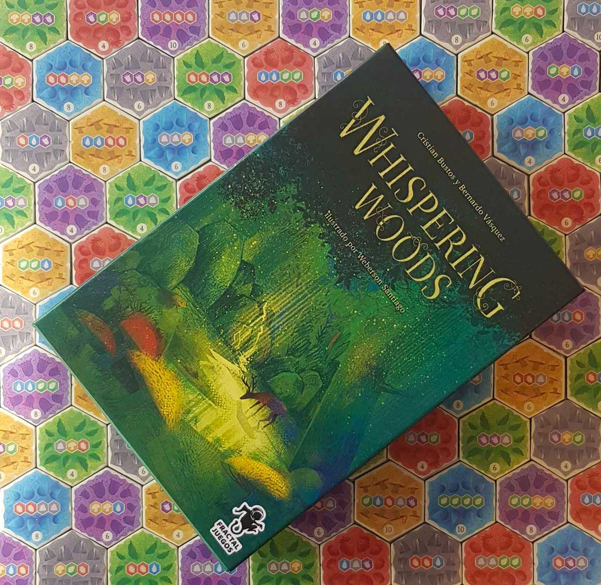 pudełko gry Whispering Woods na tle kafelków z gryPrzeniesiecie się do magicznego lasu, gdzie duszki zwierząt żyją razem w harmonii. Każde zwierzę chroni las przemierzając go i zbierając elementy potrzebne do realizowania misji. W lesie ukryty się świat pełen magii i tajemnicy. Jednakże trzeba zważać na swoje kroki, bo każde potknięcie może mieć swoje konsekwencje.